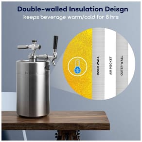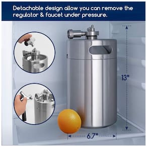 PAREDE DUPLA O isolamento de aço inoxidável de parede dupla mantém a bebida quente, fria por 8 horas. O kit dispensador de torneira growler para tanque de bebida é construído com aço inoxidável 304 de qualidade alimentar que mantém os sabores da cerveja e frescos MANTENHA A CERVEJA FRESCA O mini sistema dispensador pode manter a pressão de vácuo no barril e manter a frescura por poucas bocas. Perfeito para homebrew, rascunho e artesanato PROJETO DERACHABLE O estilo de tampa de lança permite que você destaque o regulador e o bico, mantendo o conteúdo do barril sob pressão para zenamento. , capacidade de 5L e o tamanho de 15 x 15 x se encaixa no refrigerador , geladeira doméstico padrão e é fácil de transportar REGULADOR ATUALIZADO O regulador atualizado mostra uma pressão mais precisa. Monitore o PSI atual do medidor do regulador, ajuste a pressão girando o botão de ajuste para fazer a cerveja obter carbonatação e espuma perfeitas SISTEMA DE CARTUCHO DE CO2 Parafuse os cartuchos de gás CO2 rosca de no regulador para fornecer carbonatação pressurizada ao seu sistema de fabricação de barril. A cápsula de 16g pode tocar 5L de cerveja. CARTUCHO DE CO2 NÃO INCLUÍDO Marca: Não Informado