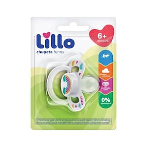 A Chupeta Funny Lillo possui formato de escudo menor, côncavo e com bordas arredondadas. Possui furos de ventilação maiores para facilitar a passagem de ar. Com bico em silicone flexível a chupeta é recomendada para bebês maiores de 6 meses. Livre de Bisfenol-A