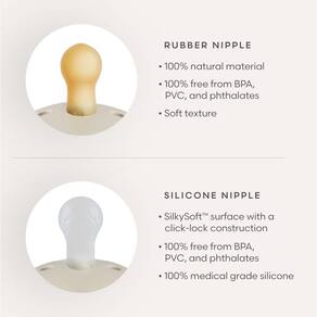 - 100% livre de BPA, BPS, PVC e ftalatos. As chupetas são feitas com borracha natural e podem se expandir com o uso.