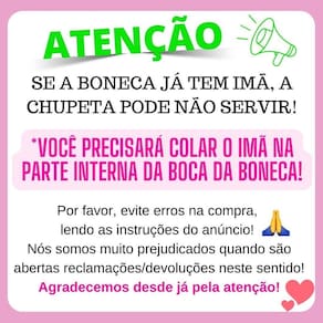 1. A chupeta já vem com o imã colado? Sim, a chupeta já vem pronta para uso, com o imã totalmente embutido e protegido para não danificar a boquinha da boneca.