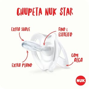 Exclusiva e única a Chupeta NUK Star possui formato que contorna o rosto do bebê de maneira suave sem cobrir o nariz do pequeno facilitando sua respiração. Seu bico em silicone possui formato assimétrico NUK Oral Fit 2.0 ou seja, 35% mais fino e 45% mais suave, além de ser mais macio e estreito Se encaixa perfeitamente na boca proporcionando maior conforto nos movimentos naturais de sucção em cada fase do crescimento do bebê. A chupeta NUK Star possui furos de ventilação com novo design para permitir maior circulação de ar e proteger a pele sensível da criança Sua argola é ideal para anexar o prendedor de chupeta, além disso, a criança pode utilizá la para coçar a gengiva. A chupeta é livre de BPA Recomendado para crianças maiores de 0 à 6 meses.