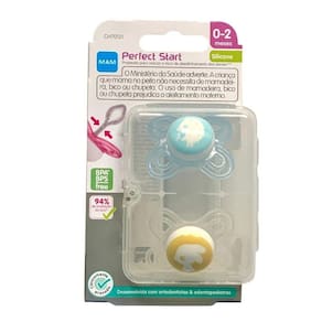 Embalagem Contém: 2 chupetas Perfect Start , recomendada para bebês de 0 a 2 meses