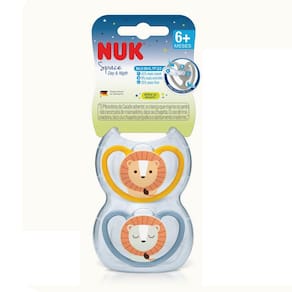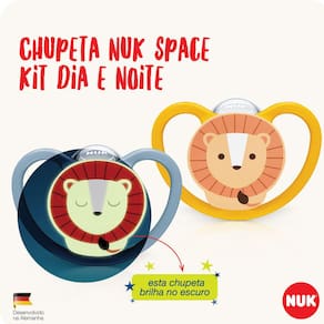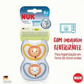 Chupeta Space da Nuk, possui nova tecnologia desenvolvida para o conforto do seu bebê ao longo do seu crescimento. Bico oral fit 2.0, mais fino e mais suave, possui máxima ventilação, mínimo contato com a pele, evitando irritação e alergia no bebê. Sua embalagem pode ser higienizada com vapor no microondas. BPA Free.