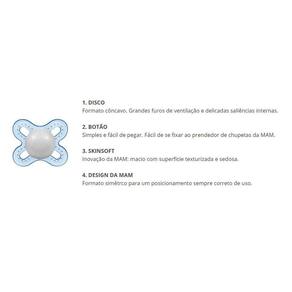 Disco: Formato côncavo. Grandes furos de ventilação e delicadas saliências internas. Botão: Rápido e fácil de segurar. Skinsoft: Inovação da MAM: macio com superfície texturizada e sedosa. MAM Design: Forma simétrica, sempre se encaixa perfeitamente na boca do bebê. Projetado com dentistas.