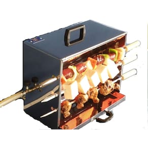 Churrasqueira 3 Espetos com Queimador Infravermelho Aço Inox A churrasqueira é comprovadamente a mais econômica, consumindo apenas 180g/h, seu churrasco sairá mais barato do que nunca. Com 1 queimador em infravermelho de 2250kcal, ela proporciona uma maior potência e rapidez para assar seu churrasco. Além do mais ela é desenvolvida em aço Inox, maior durabilidade e facilidade na limpeza. Acompanha:1 x Churrasqueira; 1x Bandeja coletora de gordura; 3x Espetos com cabo de madeira. Pra ser no botijão, Giro Manual, Não possui porta de vidro. Dimensões Externas: Comprimento 39cm x Largura 19cm x Altura 33cm . Dimensões internas: Comprimento 34cm x Largura distância do queimador para à carne 11cm, Altura 28cm.
