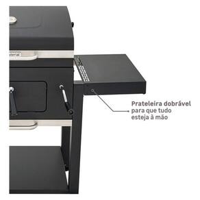 Cozimento Uniforme: A tampa restringe a circulação de oxigênio, garantindo altas temperaturas constantes e mantendo a fumaça concentrada para um sabor defumado único. Praticidade no Preparo: Com prateleiras dobráveis e compartimento inferior, você terá espaço para preparar, temperar e organizar todos os ingredientes e acessórios. Versatilidade: Duas grelhas permitem diferentes técnicas de cozimento. Utilize a grelha inferior para chamas diretas e a superior para defumação suave ou para manter os alimentos aquecidos. Controle de Temperatura: A saída de ar ajustável e o termômetro embutido garantem a precisão na oxigenação e no monitoramento da temperatura. Reabastecimento Seguro: A portinhola frontal facilita a reposição de carvão sem interromper o processo de cozimento, garantindo maior segurança e praticidade. Especificações Técnicas