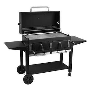 Churrasqueira com 2 lareiras independentes, chaminé, termômetro, mesass laterais dobráveis e com gancho para ferramentas, ventilação de ar na tampa e cabine de fogo, 4 rodízios de grade e cabine de calor.