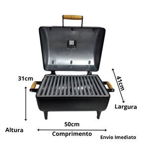 Comprimento 50 cm x 41cm larguraGrelha: comprimento 38 cm / largura 30 cm  Possui Grelha dupla face um lado lisa e outro Parrilha.