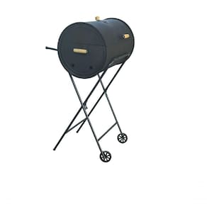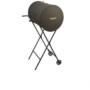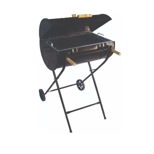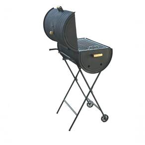 A Churrasqueira a Bafo Tambor Pequena de 50 Litros tem tamanho de 60x36cm, altura de 110cm, é produzida em Metal e Aço Tubular na cor Preta com Grelha em Aço Galvanizado. Embalagem com 1 churrasqueira a bafo 50 litros, 1 grelha com cabo de madeira, 1 carrinho, 1 bandeja para carvão e 2 rodinhas.