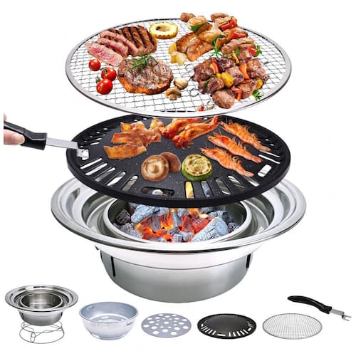 O que você obterá Corpo da grelha, tigela de carvão, placa de queima de carvão, assadeira, rede para assar, suporte de panela e cabo anti escaldante. Todas as ferramentas necessárias para churrasco estão aqui.