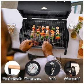 Detalhes construídos Ambas as pernas de suporte triangulares fortalecem a robustez da churrasqueira a carvão, de pé no chão, mesa, gramado mais estável sem balançar. A trava reforçada facilita a abertura ou fechamento da tampa e não abre quando você a pega. Muito portátil para transportar ao ar livre. A tampa da churrasqueira é suportada por 2 hastes de tração para função à prova de vento. O cabo de madeira liso é revestido com óleo brilhante sem rebarbas.