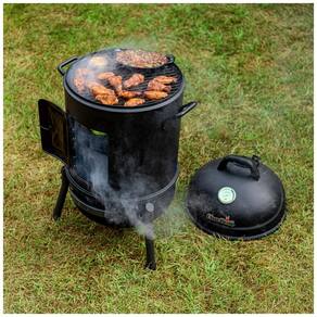 Churrasqueira a carvão portátil e compacta, com sistema de controle de fluxo de ar para regulação de temperatura, corpo revestido de porcelana para durabilidade, cinzeiro removível para limpeza fácil, duas alças de elevação da câmara, medidor de temperatura na tampa, porta de acesso ao fogo moldada e pernas de tubo de aço.