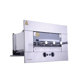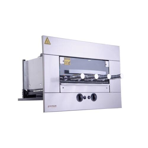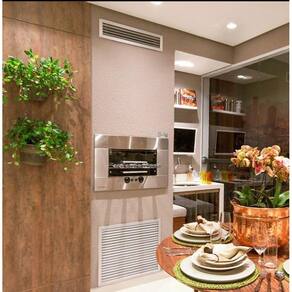 Churrasqueira a Gás de Embutir 4 Espetos Titan GLP 220V + Kit Venezianas A Churrasqueira a Gás Titan para embutir em nicho de alvenaria, complementa o seu espaço gourmet e deixa o ambiente mais moderno e prático. É ideal para assar carnes, legumes e pizza e garante um churrasco perfeito. Possui sistema rotativo, iluminação interna, queimadores infravermelhos e regulagem e controle de temperatura. A churrasqueira silenciosa e não produz fumaça. Acompanha kit de venezianas de ar. Informação Técnicas - Função: Assar carnes, peixes, legumes e pizzas - Capacidade total de carnes: 6,8 kg - Cada espeto suporta 1,7 kg de carne - Numero de espetos: 4 - Giro do espeto: 6RPM - Tensão do Motorredutor Elétrico: 12v - Potência do Motorredutor elétrico: 28W - Número de queimadores: 2 un - Controlador de queimador individual - Tensão: 220v - Frequência: 60Hz - Lâmpada: Halopin G9, 220v, 40W - Consumo elétrico 0,06 Kw/h - Válvula de segurança contra vazamento de gás - Gás: GLP - Consumo gás por queimador: 190 g/h - Consumo gás total: 380 g/h - Pressão de funcionamento do Gás: GLP 2,8 a 3,5 KPa - Acendedor automático de fogo Composição - Gabinete externo frontal modular em aço inox AISI 304 escovado - Bandeja coletora de gordura com frente em inox - Grade interna de apoio - Porta frontal de vidro temperado com sistema telescópico - 04 Espetos rotativos com cabo térmico - Sendo 03 simples e 01 triplo Medidas da Churrasqueira - Medidas produto A x L x P : 48,7 x 70,3 x 56,5 cm - Medidas da embalagem A x L x P : 58 x 64 x 73 cm - Peso Líquido: 18 kg - Peso Bruto: 20 kg Característica e Medidas da Veneziana - Função: Fluxo de ar no nicho padrão Titan 4 espetos - Fixação: com molas ou parafuso e bucha - Palhetas Fixas - Material: Em Alumínio - Cor padrão: Alumínio Anodizado - Dimensão Veneziana Superior: 56 cm largura x 12 cm altura - Dimensão Veneziana Inferior: 56 cm largura x 50 cm altura - Medidas embalagem A x L x P : 20 x 65 x 63 cm; - Peso liquido 2,8kg; - Peso bruto 3,4kg