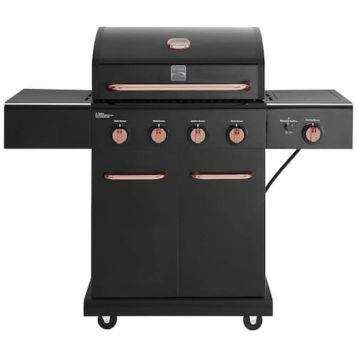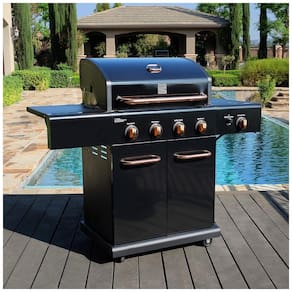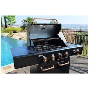SAÍDA DO QUEIMADOR 4 queimadores principais em tubo de aço inoxidável. Cada um carrega 10.000 BTUs. Inclui um queimador lateral de 12.000 BTU. O BTU total é de 52.000. ELEGANTE Preto com botões e alças de acento de cobre proporcionam um toque elegante. FÁCIL DE INICIAR A ignição eletrônica torna a partida desta grelha tão fácil quanto apertar um botão com sistema de ignição individualizado. FÁCIL DE USAR As portas articuladas facilitam a entrada e saída do compartimento inferior. O tanque de propano está convenientemente localizado, tornando a troca de garrafas uma tarefa simples. CONVERTÍVEL PARA GÁS NATURAL Requer kit de conversão de gás natural adicional vendido separadamente peça PP 20300 NS ASIN B0858WY821 e instalação profissional Marca: Não Informado