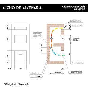 DESIGN E ESTRUTURA: - Painel frontal MODULAR em aço inox AISI 304 escovado; - Porta frontal de vidro temperado com sistema telescópico; - Grade interna de apoio; - Válvula de segurança contra vazamento de gás; - Bandeja coletora de gordura com frente de inox; - Controlador de queimador individual; - 06 Espetos rotativos com cabo térmico, sendo 05 simples e 01 triplo; - Lâmpada interna; - Acendedor automático de fogo.