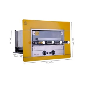 DESIGN E ESTRUTURA: - Acabamento superior, em aço INOX 304; - Porta frontal de vidro temperado com sistema telescópico; - Grade interna de apoio; - Válvula de segurança contra vazamento de gás; - Bandeja coletora de gordura com frente de inox; - Controlador de queimador individual; - 04 Espetos rotativos com cabo TÉRMICO – Sendo 03 simples e 01 triplo; - Lâmpada interna; - Acendedor automático de fogo.