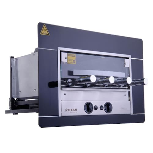 A Churrasqueira a Gás Titan Titanium Preto para embutir foi projetada para transformar o seu espaço gourmet em um ambiente prático e elegante. Ideal para assar carnes, legumes e pizzas, ela proporciona um saboroso churrasco com facilidade. Seu sistema de espetos rotativos com giro constante e os queimadores infravermelhos asseguram o preparo uniforme dos alimentos, enquanto a iluminação interna facilita o acompanhamento do processo. O design em vidro temperado com detalhes em inox complementa o ambiente com modernidade e sofisticação. Com funcionamento silencioso e sem produção de fumaça, possui porta frontal de vidro temperado, bandeja coletora de gordura e válvula de segurança contra vazamento de gás, garantindo praticidade e segurança durante o uso.