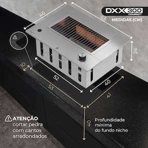 Churrasqueira a gás compact dxx300 - gás natural - grelha argentina - acabamento em teflon - sem tampa Churrasqueira a gás de embutir dxx 300: muito mais churrasco mesmo com pouco espaço procurando uma churrasqueira a gás que dê o mínimo de trabalho e proporcione o máximo de conforto Conheça a poderosa dxx 300. A dinoxx pensou em tudo para facilitar sua experiência na hora de churrasquear. Desde a instalação até o uso: absolutamente tudo foi pensado para transformar o churrasco em casa em algo mais prático e prazeroso com a dxx 300. Portanto, se você tem pouco espaço, mas não abre mão do churrasco em casa, esta é a churrasqueira a gás de embutir ideal. E para completar, a dxx 300 passa a fazer parte da decoração com design minimalista em aço inox e acabamento impecável. Conheça a famosa boquinha do dragão: A churrasqueira a gás de embutir dxx 300 é o nosso modelo compacto especialmente recomendado para atender apaixonados por churrasco que possuem pouco espaço físico para instalar a sua churrasqueira. E mesmo sendo compacta, possui 02 queimadores em uma área menor de cocção, proporcionando uma potência calorífica superior aos outros modelos residenciais. Dessa forma, atende perfeitamente até 15 pessoas no conforto do seu lar. de muito churrasco Benefícios da churrasqueira Churrasqueira a gás de embutir: linha compacta e muito poderosa; assa um delicioso churrasco com pouquíssimo trabalho e produz o mínimo de fumaça, dispensando até a coifa, na grande maioria dos ambientes; fabricada 100% em aço inox; acessórios e grelhas removíveis; design minimalista; praticidade na limpeza; válvula de segurança corta gás safe stop . Especificações técnicas 100% em aço inox 304: grelhas, tampo, bandeja coletora de gordura; suportes para espetos; aço inox 430: cocho; 02 queimadores a gás infravermelho geração de energia por queimador 2250 kcal/h ; 01 botão com regulagem de temperatura do queimador; pressão de trabalho do queimador: glp botijão 2,8 kpa - glp encanado 2,5 kpa - gn encanado 1,25 kpa; bicos injetores com de 0,92mm gás glp e 1,4mm gás gn; sistema safe stop válvula de segurança corta gás ; acendimento automático pilha . Marca: Não Informado Ean: 7898973523595
