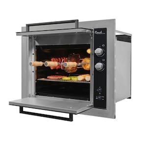 Caracteristicas: Quantidade de espetos: 3 espetos Revestimento interno: Tecnologia EasyClean -de facil limpeza- Lampada: Sim Bandeja coletora para residuos: Sim Consumo: 380 g/h de GLP Potencia do motor: 3x4W Potencia das Bocas: 2x2250 Kcal Acendimento automatico: Sim Espetos rotativos: Sim Dimensoes do nicho -AxLxP-: 56x67x60cm