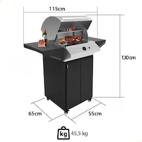 - Compacta e eficiente, mede 115x65x130cm, com grelha de 55x55cm, unindo desempenho profissional e limpeza fácil em um só produto.