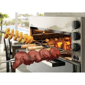 Um produto pratico e facil de usar. A Churrasqueira a Gas Fischer Ranch 5 espetos foi desenvolvida tanto para embutir como para bancada, possui acabamento em aco inox escovado e integra-se perfeitamente a varios estilos de ambientes. A vantagem de uma churrasqueira a gas Fischer Ranch vai ainda muito alem: acendimento automatico, bandeja esmaltada easy clean, lampada interna, espetos rotativos e o controle individual dos queimadores sao diferenciais que facilitam e proporcionam uma experiencia ainda mais agradavel no preparo de um bom churrasco, sem emitir fumaca.