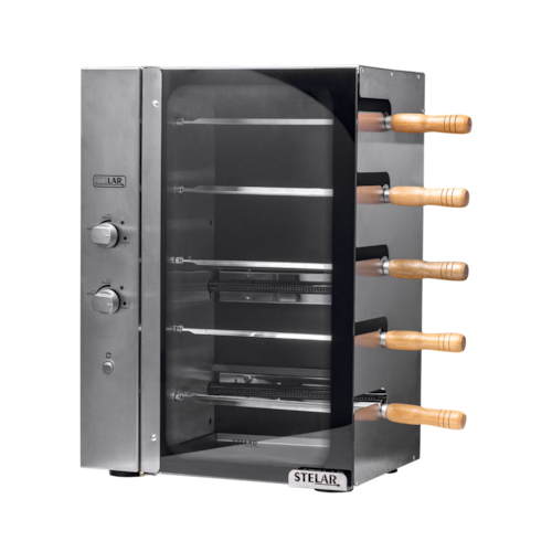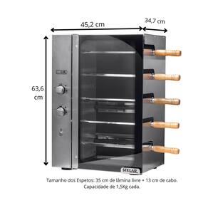 Dimensões internas: Largura: 34 cm x Altura 58 cm x Profundidade 26 cm. Tamanho dos Espetos: 35 cm de lâmina + 13 cm de cabo e Capacidade de 1,5Kg cada.