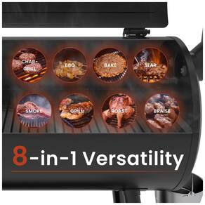 Com 8 em 1 de versatilidade, a grelha permite assar, grelhar, fumar, churrasco, assar, refogar, churrasco e grelhar, capacitando você a experimentar várias técnicas culinárias para criar refeições deliciosas que atendam às suas preferências de gosto. Com rodas AllTerrain e alça de elevação, alça lateral, a churrasqueira é portátil e fácil de mover. Possui 553 m de área de cozinha, capacidade de depósito de 4,54 quilos e peso de 34,92 quilos, sendo perfeito para casais e famílias pequenas.