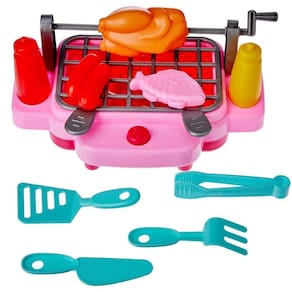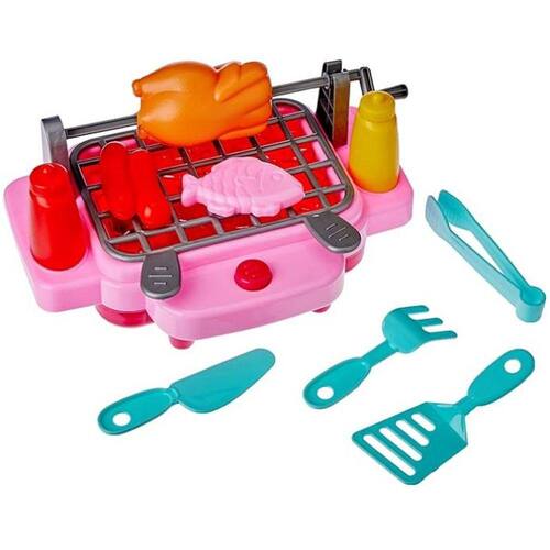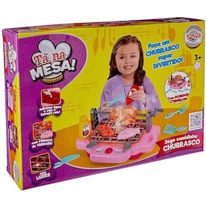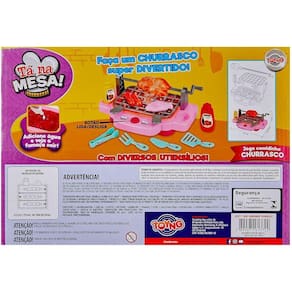 Conteúdo da Embalagem: 1 Churrasqueira, 1 grelha, 1 espeto, 1 ketchup, 1 barbecue, 1 frango, 1 peixe, 2 salsicha fixas, 4 utensílios, 2 suportes para espeto, 1 frasco conta gotas, 1 cartela de adesivos