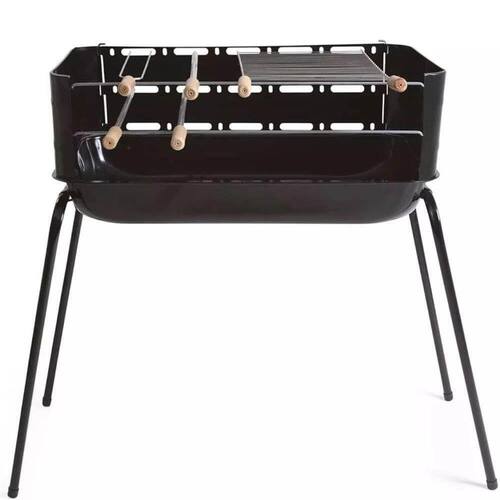 Acompanhada: Uma grelha com cabo de madeira, três espetos simples de 58cm e um espeto duplo de 58cm.
