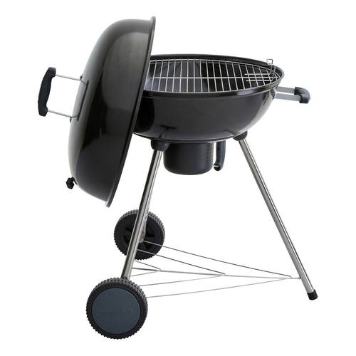 Com dimensoes compactas de 97 cm de altura, 66 cm de largura e 65 cm de profundidade, a churrasqueira e facil de transportar e armazenar. O diametro de 55 cm da grelha de aco oferece amplo espaco para grelhar uma variedade de alimentos, enquanto a tampa preta, tambem em aco, ajuda a reter o calor e intensificar o sabor dos alimentos. As rodas integradas facilitam a movimentacao, tornando-a perfeita para eventos em qualquer ambiente externo. A presenca de alcas ergonomicas assegura um manuseio seguro e confortavel.