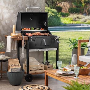 Churrasqueira a carvão com bandeja, design robusto e elegante, fabricada em aço resistente. Possui rodas para fácil transporte e tampa funcional para cozimento eficiente. Ideal para churrasco tradicional a carvão.Vendido por Home Living e entregue por Extra
