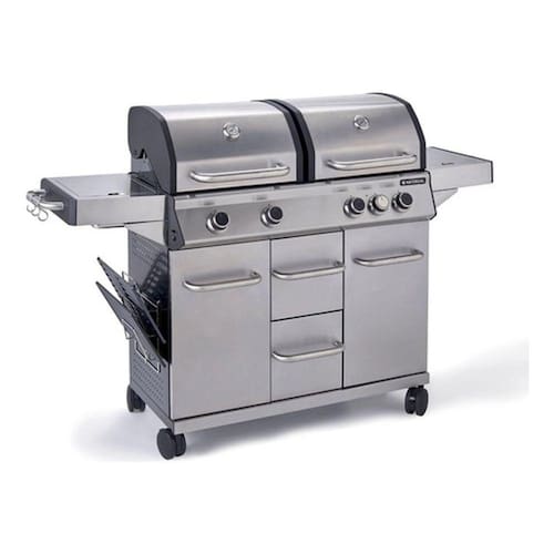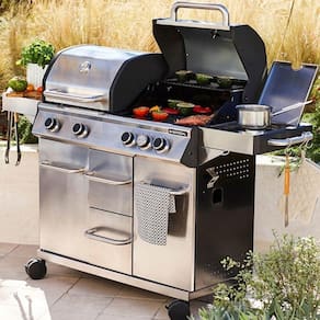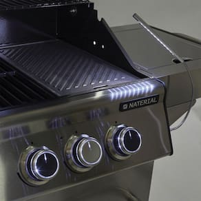 Churrasqueira a gás Hudson com função de chapa, recomendada para até 13 pessoas. É feito de aço esmaltado e aço inoxidável cinza com ignição. Possui 4 queimadores de aço inoxidável de 14 kW, 1 queimador lateral de 3 kW, 4 grades de ferro fundido com acabamento brilhante, 2 deles superiores. Inclui 2 pratos de 41,5 x 24 cm (largura x comprimento), carrinho com 4 rodas de rodízio para facilitar o transporte, tampa de cozinha com termômetro integrado, abridor de garrafas, 2 mesas laterais com tampas, uma delas contém uma placa de corte em bambu e duas gavetas culinárias, onde você pode armazenar molhos ou produtos picados. Incorpora 3 ganchos em forma de S para pendurar utensílios de cozinha, bandeja removível para coletar graxa, porta-guardanapos, 2 lâmpadas de iluminação LED ajustáveis com carregamento USB, 2 portas frontais e 2 gavetas grandes onde é possível armazenar todos os produtos de cozinha. Além disso, inclui uma garantia de 5 anos. Ideal para desfrutar do seu melhor churrasco ao ar livre. Medidas para churrasco: 55 x 119 x 183 cm (largura x altura x profundidade). Medidas da grelha: 41,5 x 24 cm (largura x altura). Medidas da grade superior: 41,5 x 24 cm (largura x altura)