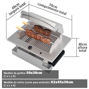 Garantia: 90 dias / Peso: 15kg / Cor predominante: inox / Referência: 7026537581907 Dimensões: 70cm (C) x 48cm (L) x 30cm (A); Dimensões da grelha: 50cm (C) x 38cm (L); Dimensões do nicho (corte para embutir): 62cm (C) x 45cm (L) x 36cm (A); Quantidade de queimadores: 2; Alimentação: gás GLP; Mangueira compatível: comum, de baixa pressão (não acompanha o produto); Acendimento: automático; Potência: 3.500 Kcal; Material: aço inox 304.