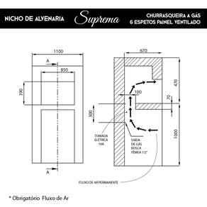 DESIGN E ESTRUTURA: - Painel frontal modular em aço inox AISI 304 escovado; - Botão de faísca em inox; - Botões de controle (motor e lâmpada) em inox com LED; - Registro de controle da temperatura com botões injetados em alumínio; - Válvula de segurança contra vazamento de gás; - Espetos rotativos com cabo TÉRMICO em INOX.