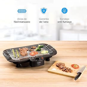 Controle de temperatura, 2 níveis para o grill, grelha e resistência removíveis, Grill amplo, Indicação luminosa de funcionamento, Termostato de controle de temperatura, Bandeja para anti-fumaça, Utilização: Mesa ou bancada.Lâmpada piloto