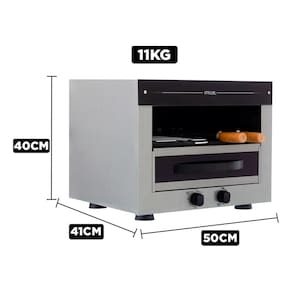 🔸 Potência: 2000W 🔸 Tensão: 220V 🔸 Espetos: 3 rotativos + 2 fixos em aço inox 🔸 Bandeja coletora de resíduos: Sim 🔸 Prateleira deslizante: Sim 🔸 Luz interna: Sim 🔸 Timer: 120 minutos com desligamento automático 🔸 Dimensões: 50 cm (L) x 41 cm (A) x 42 cm (P) 🔸 Peso: 11 kg 🔸 Material: Aço kromanox + vidro temperado