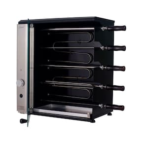 Churrasqueira elétrica de bancada vertical com 5 espetos rotativos (4 simples e 1 triplo). Ideal para ambientes internos, não produz fumaça. Possui painel curvo em inox, porta de vidro temperado e bandeja coletora de gordura. Potência total de 2100W. Seletor de temperatura com níveis indicativos. Espetos com cabos de madeira preta. Capacidade para até 8,5 kg de carne (1,7kg por espeto).Vendido e entregue por Olist Top