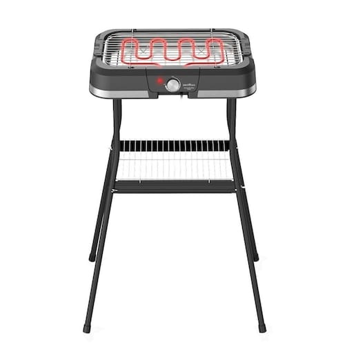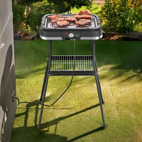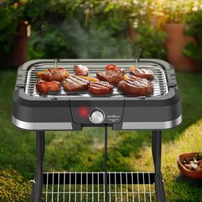 Churrasqueira elétrica com suporte, ideal para uso em ambientes internos e externos. Possui bandeja coletora de gordura, reservatório de água para reduzir a fumaça e seletor de temperatura.Vendido por Guimepa Shop e entregue por Extra