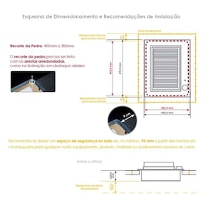 A churrasqueira elétrica atinge temperaturas elevadas, e portanto não deve ser instalada sobre ou próxima de materiais inflamáveis e sensíveis ao calor, como eletrônicos, MDF, MDP, madeiras, laminados, tecidos, couro, plásticos e materiais sintéticos. A instalação deve ser feita em nicho previamente preparado na bancada de pedra (Mármore, Granito, Quartzo, Venato, entre outras), que deve ser cortada com os cantos arredondados para evitar pontos de fragilidade.