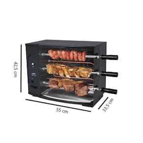O sistema de rotação de espetos permite assar de forma homogênea todos os tipos de carne. Seu alimento fica muito mais saboroso. Produto certificado pelo INMETRO. Assa frangos inteiros e permite melhor circulação do ar. Garante melhor distribuição da temperatura no interior e um assado mais uniforme. Não produz fumaça.