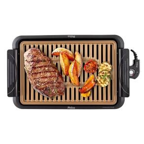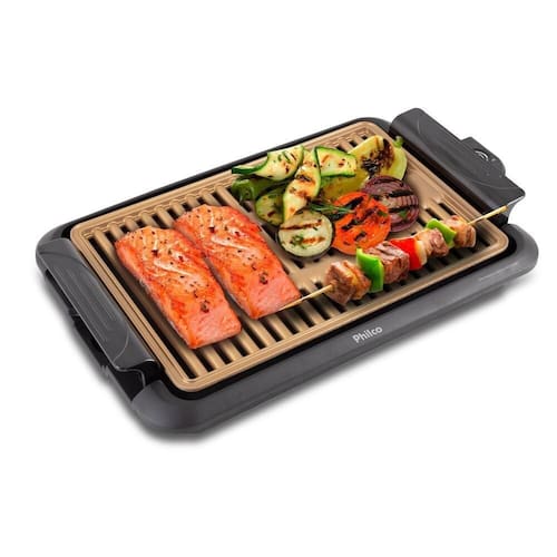 Características Gerais do produto Churrasqueira Elétrica Philco PCQ1200D 1200W cometros seletor de 5 níveis de temetrosperatura, grelha antiaderente remetrosovível cometros revestimetrosento Maxx Gold, alças laterais, pés antiderrapantes e bandeja coletora de gordura de 1L.