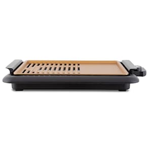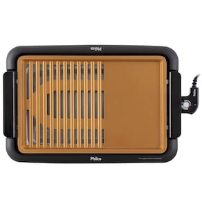 - Grelha de alumínio com revestimento antiaderente dourado - Revestimento antiaderente base água - Alças laterais com toque a frio (Baquelite) - 40% chapa Lisa e 60% Grelha - Acompanha Bandeja de água/ Coletor de gordura - Grelha removível - Baixa emissão de fumaça - Seletor de temperatura - Termostato removível - Pés antiderrapantes - Base/Suporte de plástico - Sistema de segurança: Só liga se estiver montado na base - Composição: Metal e Plástico