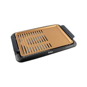 Dimensões AxLxP (mm): 80x355x540. Material: Metal e Plástico. Níveis de Temperatura: 5. Chapa Antiaderente: Sim. Alças Laterais: Sim, com toque a frio (Baquelite). Bandeja Coletora para Resíduos: Sim. Base Antiderrapante: Sim. LED Indicador de Funcionamento: Sim. 60% grelha e 40% chapa lisa.Churrasqueira Elétrica Philco PCQ1500D Dourada -