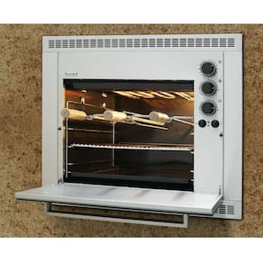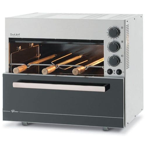 Churrasqueira Elétrica Ranch Grill Fischer Inox com 3 espetos rotativos, potência de 3200 W, controle individual das resistências, timer de até 2 horas, iluminação interna e bandeja coletora de resíduos.Vendido e entregue por WebContinental