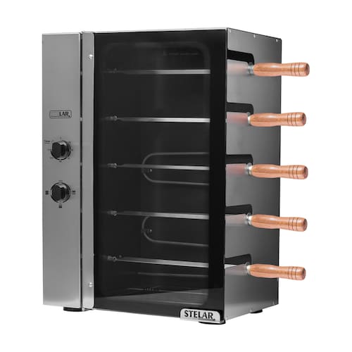 Funcionamento elétrico. Funções: assa diferentes tipos de carne Potência: 2.500 Watts Tensão/voltagem (v): 127 ou 220 (escolha no momento da compra) Com 5 espetos rotativos em inox Bandeja coletora de resíduos.