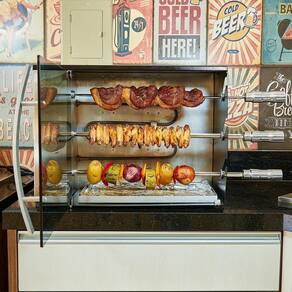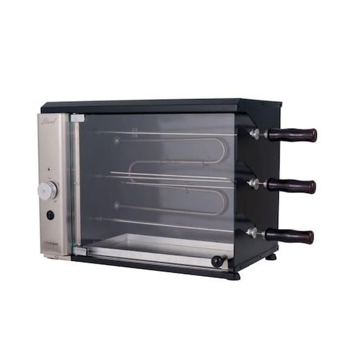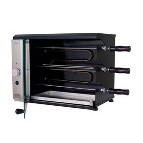 Churrasqueira elétrica vertical de bancada com 3 espetos rotativos (2 simples e 1 triplo), porta de vidro temperado, painel frontal curvo em inox, bandeja coletora de gordura, luz piloto e seletor de temperatura com níveis indicativos.Infelizmente não temos estoque do produto que você está procurando no momento.