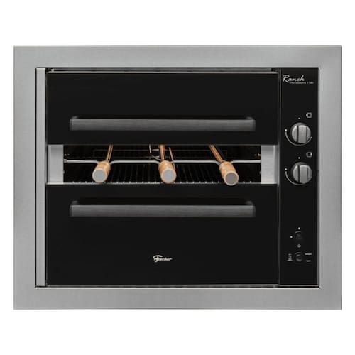 Churrasqueira a gás Fischer Ranch com 3 espetos rotativos automáticos, acendimento superautomático, acabamento em aço inox escovado, queimadores infravermelhos com controle individual, interior esmaltado Easy Clean, bandeja coletora removível, iluminação interna e instalação embutida.Vendido e entregue por WebContinental