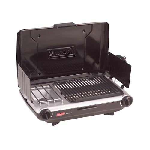 Coleman Grelha/fogão 2 em 1 de acampamento a gás propano de mesa, 2 bocas - Design 2 em 1 para que você possa usar a grelha e o fogão ao mesmo tempo - 130 sq. pol. Área de grelha; fogão serve para 25,4 cm. panela - Até 20.000 BTUs totais de potência de cozimento - Regulador de pressão PerfectFlow para desempenho consistente, mesmo em condições extremas - A tecnologia PerfectHeat oferece cozimento mais eficiente com menos combustível - 2 queimadores ajustáveis para controle preciso da temperatura - Os painéis WindBlock protegem os queimadores do vento ou dobram para baixo para uso como mesas laterais - Fogão de aço aluminizado resistente à ferrugem