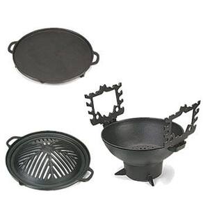 Churrasqueira a Carvão Modelo Gengis Khan 4 peças, toda em ferro fundido tem durabilidade imensurável. 28 cm de diâmetro x 19,5 cm de altura (fogareiro). Acompanha Grelha Japonesa , chapa Bifeteira 32 cm e suporte para espetos. Faça seu churrasco de forma fácil, econômica e sofisticada, grelhado, na chapa ou no espeto.