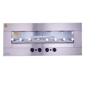 DESIGN E ESTRUTURA: - Painel frontal MODULAR em aço inox AISI 304 escovado; - Porta frontal de vidro temperado com sistema telescópico; - Grade interna de apoio; - Válvula de segurança contra vazamento de gás; - Bandeja coletora de gordura com frente de inox; - Controlador de queimador individual; - 08 Espetos rotativos com cabo térmico, sendo 06 simples e 02 triplo; - Lâmpada interna; - Acendedor automático de fogo.